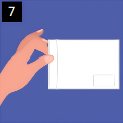 Inserisci la bustina grande MYGENETIX (contenente il tampone chiuso nella bustina piccola) e il Modulo Richiesta Test compilato e firmato nella busta preaffrancata per la spedizione che hai trovato all'interno della scatola.